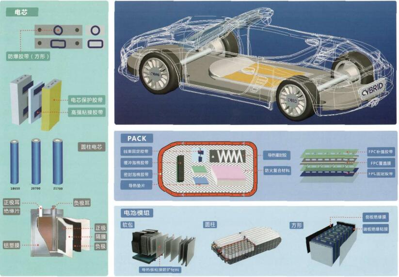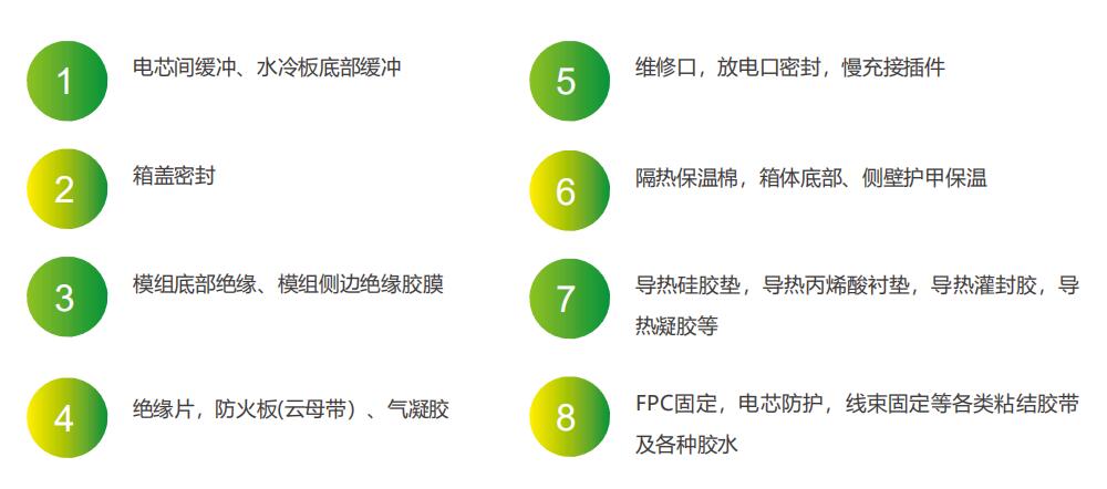 新能源動(dòng)力電池為新能源汽車(chē)提供動(dòng)力,其結(jié)構(gòu)復(fù)雜,涉及材料較多。模組方面 有:電芯隔墊、電芯安全防護(hù)材料等,電池箱方面方面涉及箱體密封、接插件密封、 箱體絕緣、導(dǎo)熱、保溫及安全防護(hù)材料等。