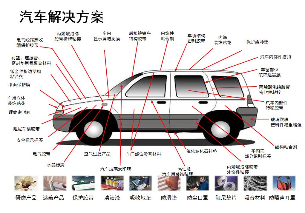 模切在傳統汽車行業中涉及內容非常廣泛,常規產品中包含:汽車字牌,防擦條膠帶、保溫棉,阻尼膠帶、汽車周身雙面膠帶(倒車雷達,后視鏡等)、汽車內飾蘑菇扣、EPDM發泡墊圈、外飾貼畫,防石擊片等等都屬于模切成品。